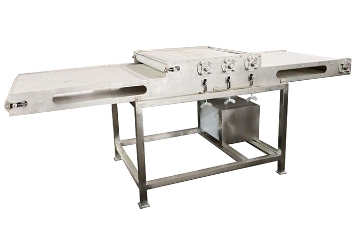 其結構由機架、驅動機構、傳動機構、成形機構等部分組成。魚片直接放入搟片機輸送帶上,在壓輥壓力作用下,通過定做的模板,加工出特定形狀的魚片,外形平整美觀,纖維疏松,吃起來口感綿柔,不粘牙齒。